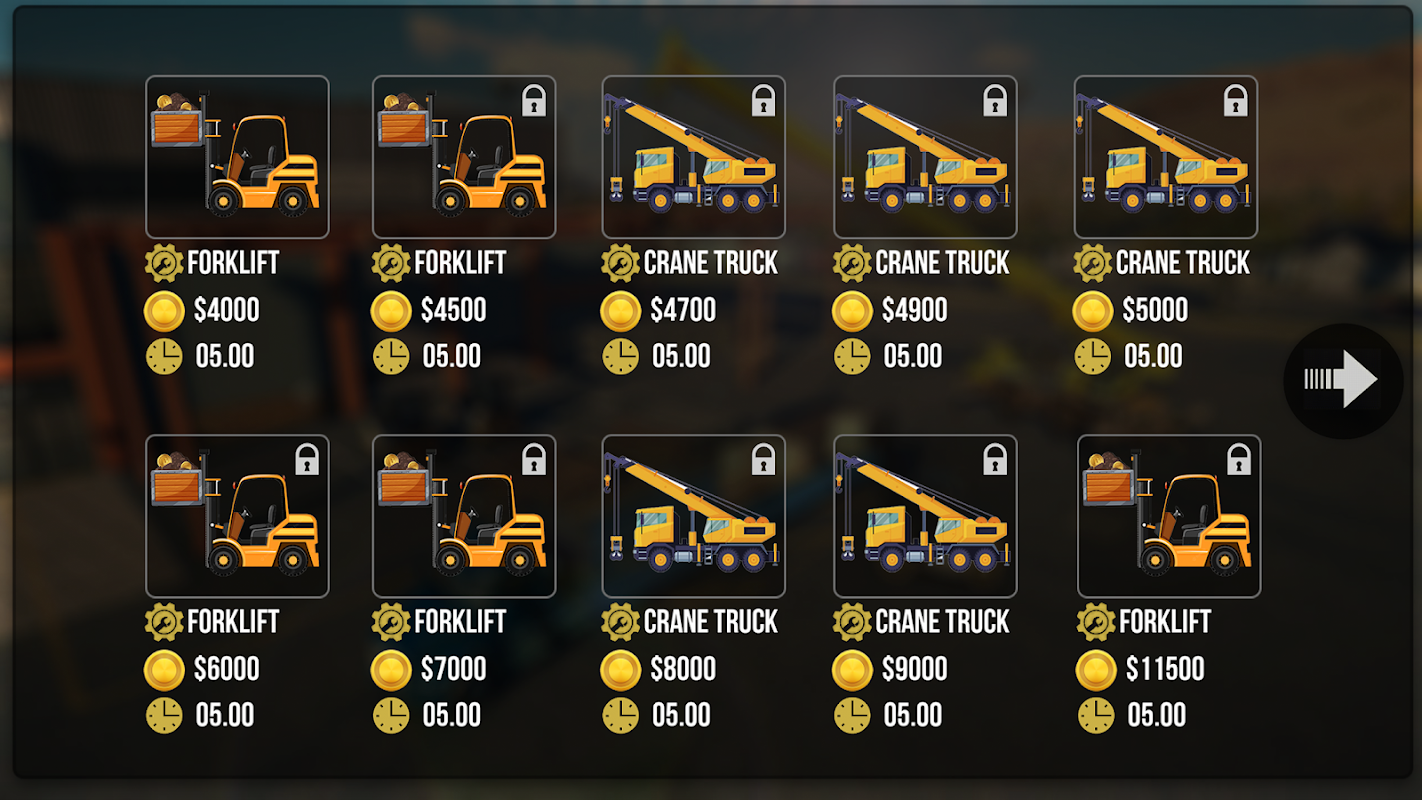 Kendaraan dalam game ini, yang memiliki fitur fisika kendaraan peralatan konstruksi yang realistis, adalah sebagai berikut: Ada berbagai kendaraan seperti truk derek, truk sampah, forklift, pemuat teleskopik, derek menara, pemuat backhoe, ekskavator, pikap.