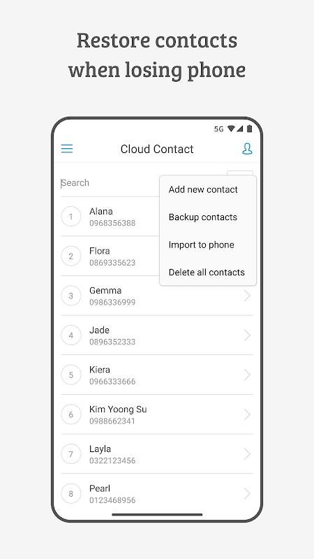 You can back up your contacts to the cloud and easily transfer your contacts to other devices or restore your contacts when you lose your phone.
