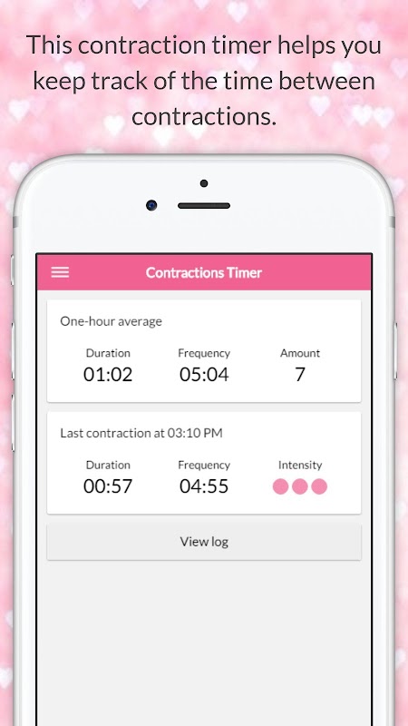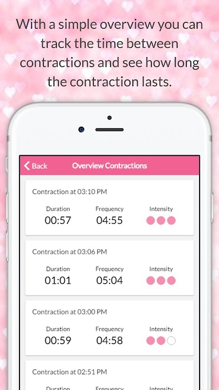 Timer kontraksi ini membantu Anda melacak waktu antara kontraksi. Anda juga dapat menunjukkan seberapa banyak rasa sakit Anda alami selama kontraksi menggunakan skala nyeri.