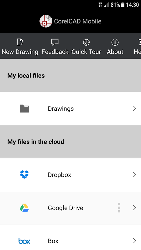 Berbagi file yang Anda buat dengan CorelCAD atau perangkat lunak DWG CAD pada desktop atau laptop dengan CorelCAD Mobile. Untuk mendapatkan akses, hanya menggunakan Box, Dropbox atau Google Drive untuk menyinkronkan gambar Anda di cloud atau toko gambar secara lokal pada perangkat Anda.