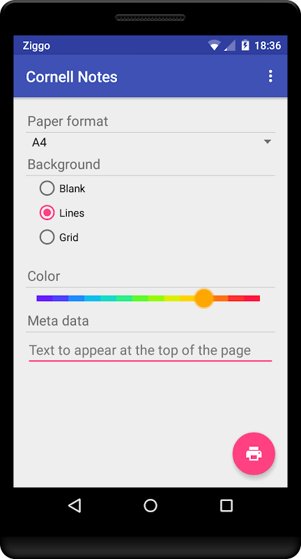 Aplikasi ini memungkinkan Anda untuk membuat halaman-halaman untuk ukuran halaman yang berbeda. Anda dapat mencetak halaman dalam berbagai warna dan pilih kosong, berjajar atau latar belakang grid untuk daerah catatan Anda. Anda juga dapat memasukkan teks singkat untuk muncul di bagian atas halaman.