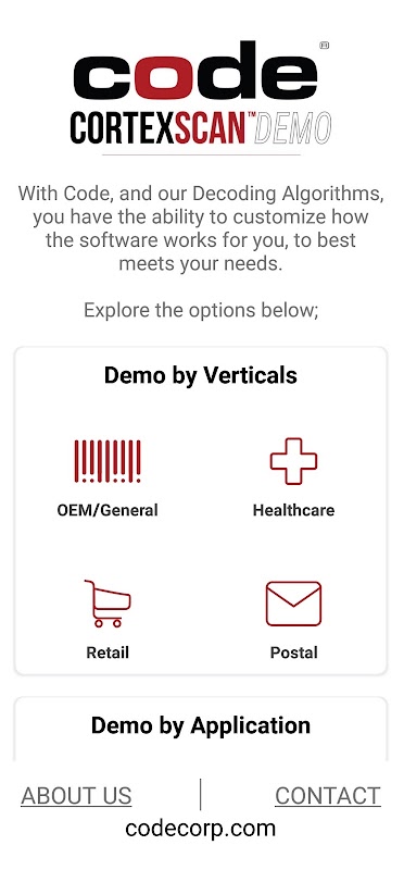 Evaluasi aplikasi demo ini dan kemudian hubungi Code Corporation untuk informasi lebih lanjut menggunakan tombol Hubungi Kami di dalam aplikasi.