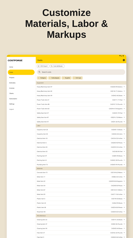 Butuh estimator yang andal untuk pekerjaan lapangan? Aplikasi ini dioptimalkan untuk digunakan sebagai penaksir konstruksi serah terima, memberikan tim Anda visibilitas penuh terhadap harga, item baris, dan perubahan secara real-time. Ini adalah solusi sempurna bagi manajer proyek dan mandor yang perlu berbagi estimasi dengan klien dan kolega, bahkan saat berada di lokasi.