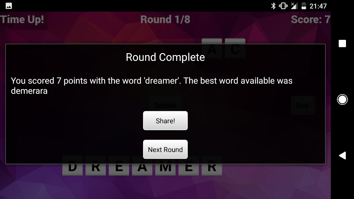 Best word revealed! At the end of the round the game tells you the best word possible - great for learning new words!