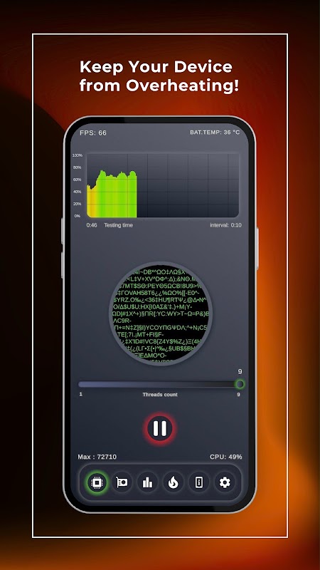 Aplikasi "Test Performance CPU GPU" memuat CPU dengan jumlah maksimum utas pada perangkat Anda dan mengukur kinerja. Anda dapat memilih berapa banyak inti yang harus dimuat. Selain itu, fungsi unik memungkinkan untuk memuat inti grafis secara terpisah dari prosesor. Jika ponsel dapat menangani pendinginan, kinerja akan tetap konsisten dari waktu ke waktu, namun, jika tidak, CPU akan melambat, mengakibatkan penurunan kecepatan.
