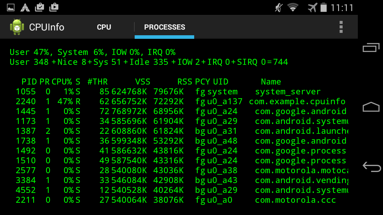 Sekarang dengan 1.1 update terbaru, Info CPU dapat menjalankan ps! Periksa proses individu dengan nama paket atau proses ID untuk query perilakunya.