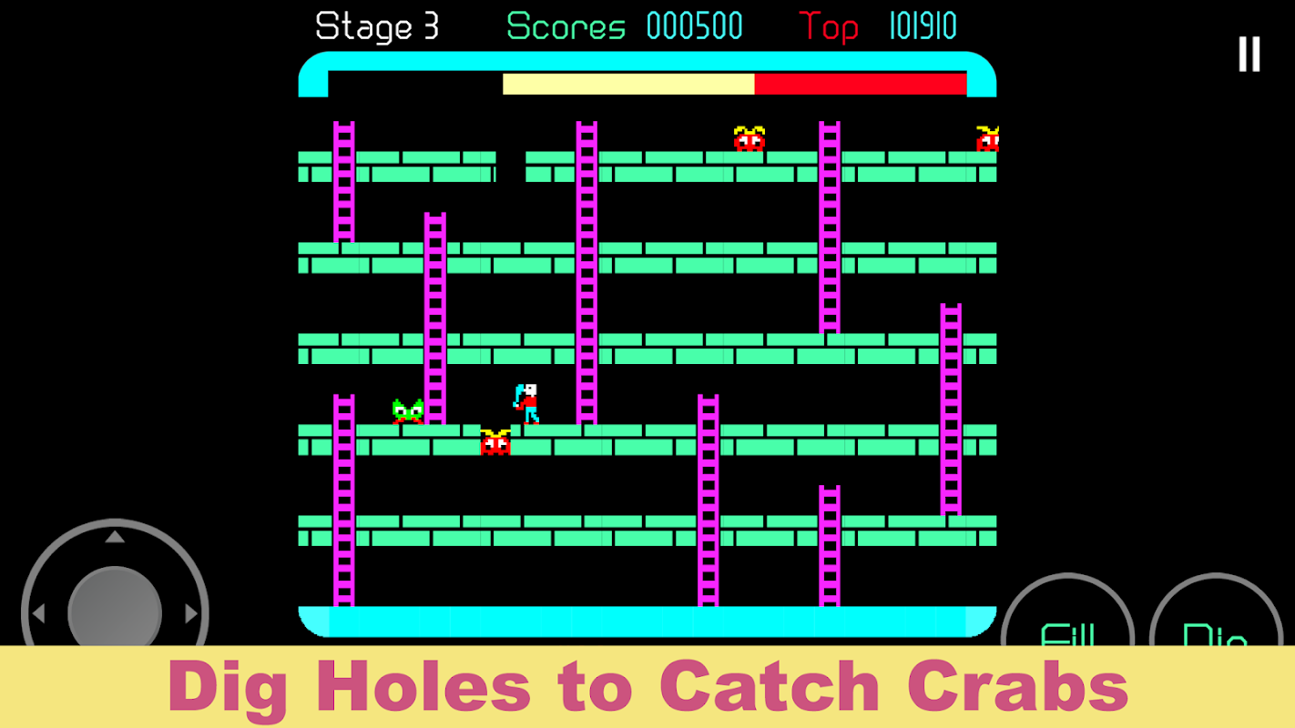 Pemain dapat bergerak di sepanjang platform dan menaiki tangga di antara platform tersebut. Tujuannya adalah untuk menggali lubang di platform dan memancing kepiting ke dalamnya.