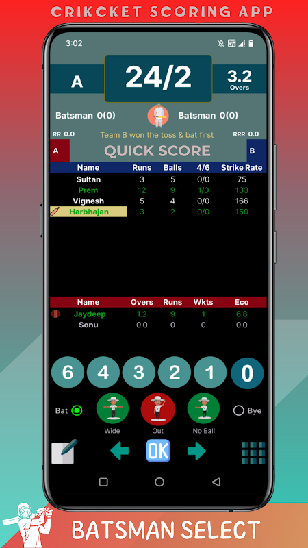 4. Pilihan Batter dan Bowler: Pilih batsman dan bowler saat ini dengan mudah dari daftar pemain yang tersedia. Skor Cepat memungkinkan pengelolaan pergantian pemain yang mulus selama pertandingan.