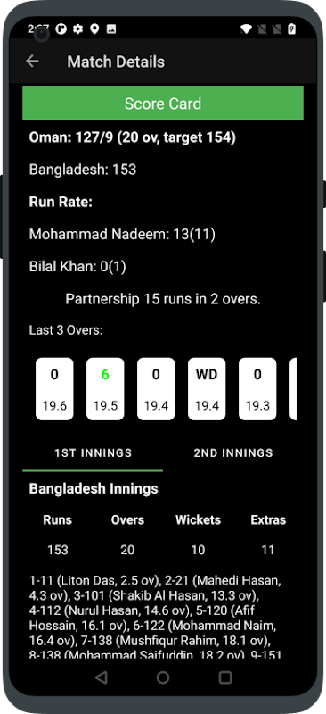 With this app you will get all the updates of a LIVE or COMPLETED cricket match. The app is totally free and it updates the score time to time.