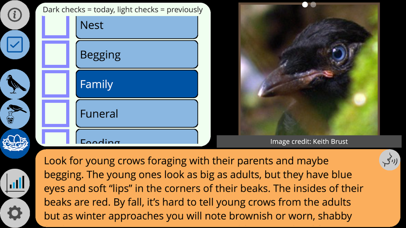 Daftar lain menjelaskan pengamatan yang terkait dengan musim kawin, seperti burung gagak remaja atau panggilan mengemis khas mereka. Siswa suka belajar tentang keluarga hewan, dan mereka senang belajar mengidentifikasi keluarga gagak. Mereka juga belajar bahwa dalam siklus kehidupan kebanyakan burung gagak muda tidak dapat bertahan hidup. Sekali lagi, jika siswa memeriksa semua item, mereka mendapatkan sertifikat untuk dibagikan dan dicetak.