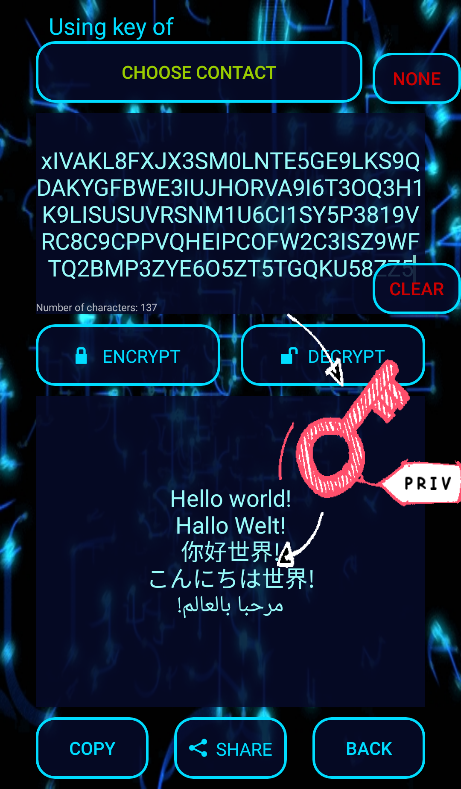 - When not choosing a contact encrypt and decrypt messages with a simple text converter on base 36