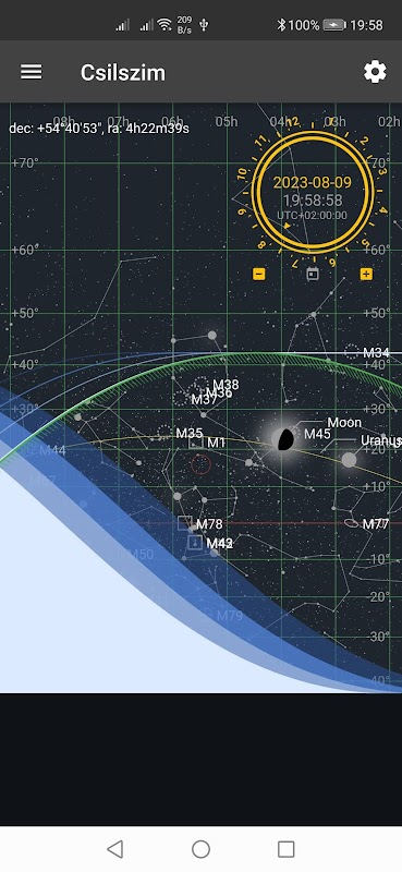 Ini menampilkan posisi langit saat ini dari objek Messier dan bintang terang secara real time. Ditampilkan dalam sistem koordinat khatulistiwa dan tanah. Objek ketinggian tinggi ditampilkan dalam warna terang, dan objek ketinggian rendah serta objek di bawah cakrawala ditampilkan dalam warna gelap.