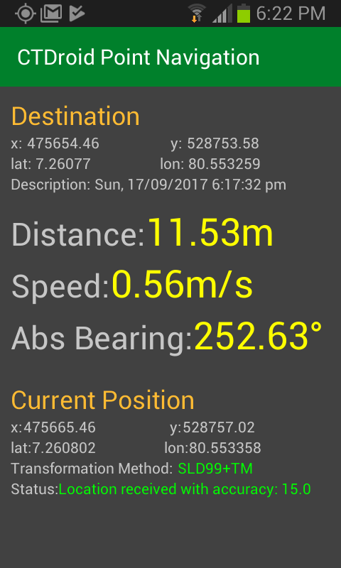 Alat ini akan mengakses informasi lokasi dari sensor GPS perangkat (atau penyedia lokasi lainnya) dan melakukan transformasi koordinat untuk mengubah nilai lintang, bujur, dan ketinggian WGS84 menjadi koordinat jaringan Nasional Sri Lanka yang mengikuti datum SLD99 atau KANDAWALA.