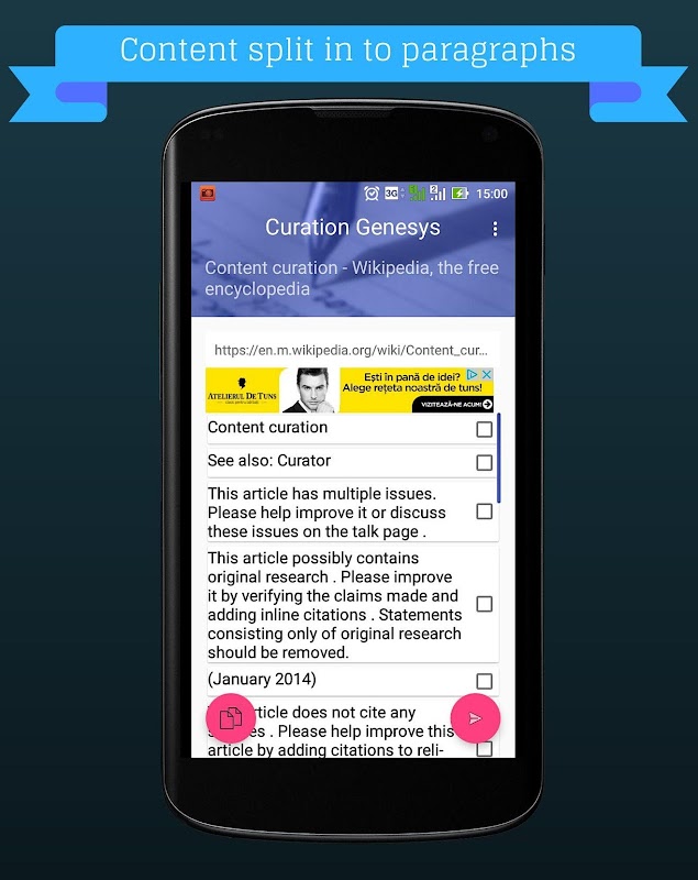 Update: Now is even easier to do content curation and content marketing. Introducing the copy button. After you have selected the desired paragraphs, you can press the copy button and all the content will be copied to clipboard. This way you can use your selected content on other publisher, not only Wordpress, like Facebook, Twitter, Blogger. But is not all. Now you can use the application not only for blogging and content marketing. You can send your friends parts from web articles. It is now the easiest way to copy and paste on mobile phone.