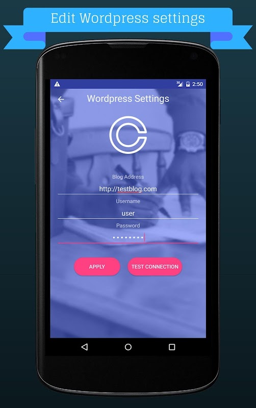 DISCLAIMER: This is a beta version for now is only supporting sending the post to one Wordpress blog as DRAFT. You can use the official WordPress app to do the final publishing