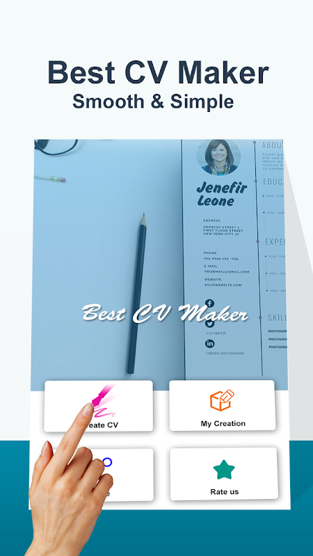 Pembuat CV & pembuat Curriculum Vitae yang membantu menciptakan CV terbaik. Cukup instal aplikasi ini gratis di android dan buat CV terbaik di atasnya dengan beberapa templat. Buat CV di aplikasi pembuat CV ini CV terbaik yang dapat Anda miliki, yang membantu Anda dalam karier profesional Anda. Sangat mudah dan sederhana untuk membuat CV, membuat resume dengan sangat mudah.