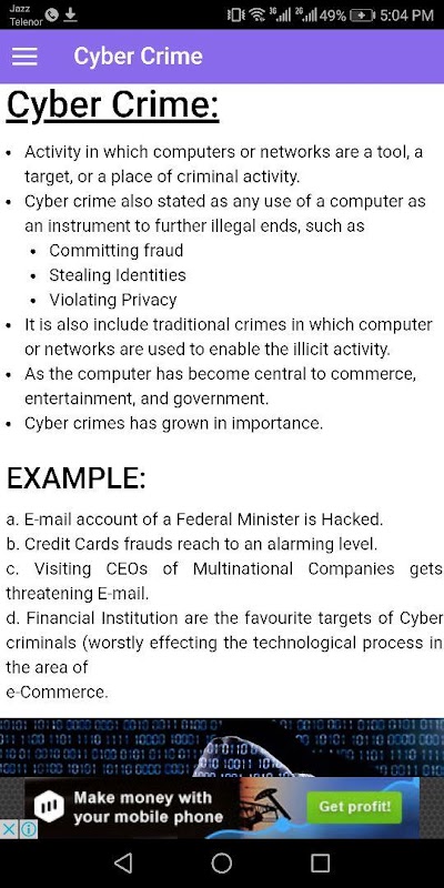 Cyber law is any law that applies to the internet and internet related technologies. This app content based on cyber law. Cyber law is very essential course in the computer science because its related to IT world. In information technology cyber law is one of the important areas of the legal system, Because internet technology develop day by day, and cyber law provide protection to people using the internet. In which include both business and everyday citizens.