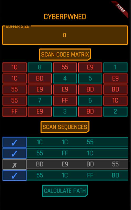 Aplikasi ini secara otomatis menemukan solusi terbaik untuk minigame Protokol Pelanggaran CP2077. Ambil gambar matriks dan urutannya, masukkan ukuran buffer Anda dan itu akan menghitung jalur paling menguntungkan yang dapat Anda ambil. Instruksi lebih detail dapat ditemukan di Panduan Uap: https://steamcommunity.com/sharedfiles/filedetails/?id=2345267849.