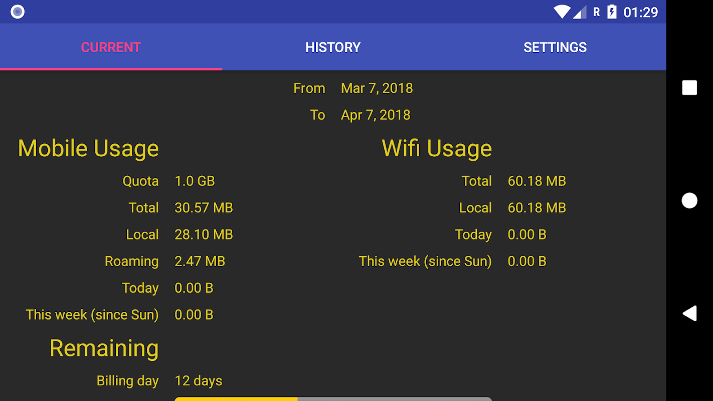 On second page, you can review usage history on daily, weekly or monthly basis.