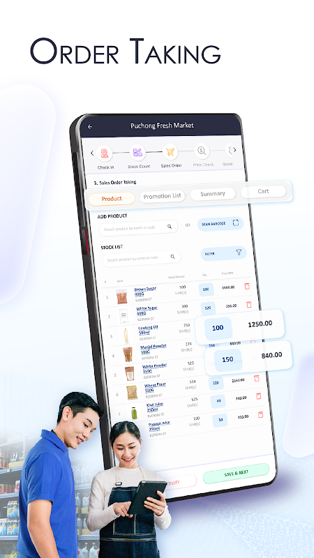 Modul pengambilan pesanan penjualan menyederhanakan proses manajemen pesanan dengan memungkinkan perwakilan penjualan untuk menangkap dan memproses pesanan langsung dari aplikasi seluler. Perwakilan penjualan dapat menelusuri katalog produk, memeriksa ketersediaan stok, menerapkan diskon jika berlaku, dan membuat pesanan secara waktu nyata. Modul ini memastikan pemrosesan pesanan yang akurat dan efisien.