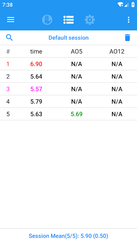 - Multiple session: shows best and worst time, average(mean) of 3/5/12/50/100, best average(mean), session mean and session average.