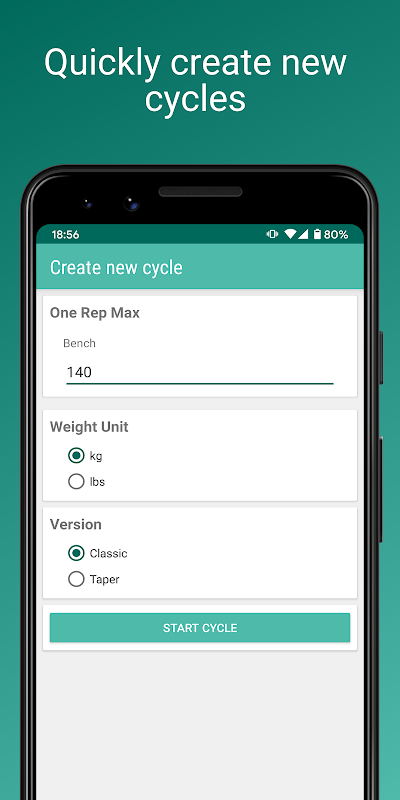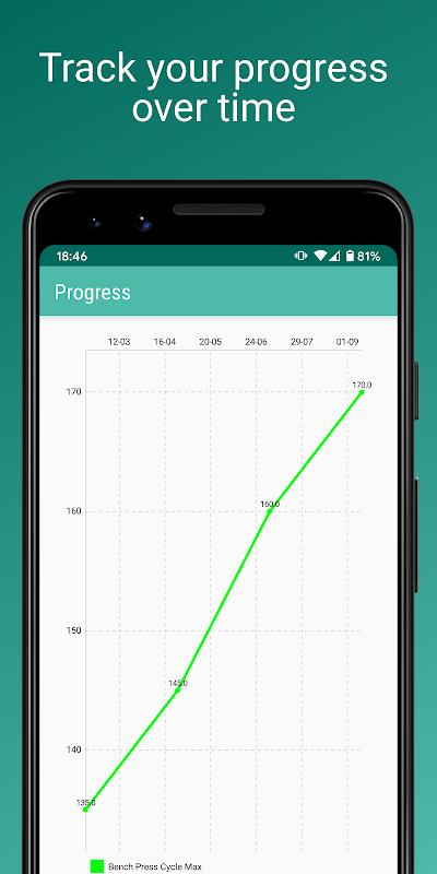Aplikasi ini akan menghasilkan siklus untuk Anda berdasarkan satu rep maksimal Anda saat ini dan memungkinkan Anda untuk melacak kemajuan Anda melalui setiap sesi dan minggu. Riwayat lengkap siklus selesai Anda disimpan dan Anda dapat melihat peningkatan kekuatan bench press Anda pada grafik.