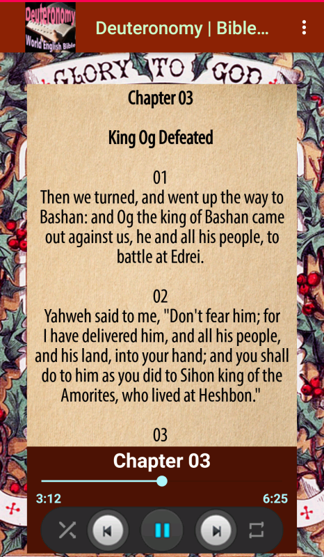 An app for anyone who want to know about Christianity directly from the source (Bible). Enjoy Complete chapter of Deuteronomy (The Book of Deuteronomy) in good quality audio with transcript (text). Enjoy the beauty of God's word anytime and everywhere -- even without internet connection (offline) -- via your Android gadget. This app presents you the complete chapter of Deuteronomy based on World English Bible (WEB). You can enjoy it all in quick, simple, and easy way. A must for devoted Christian soul.