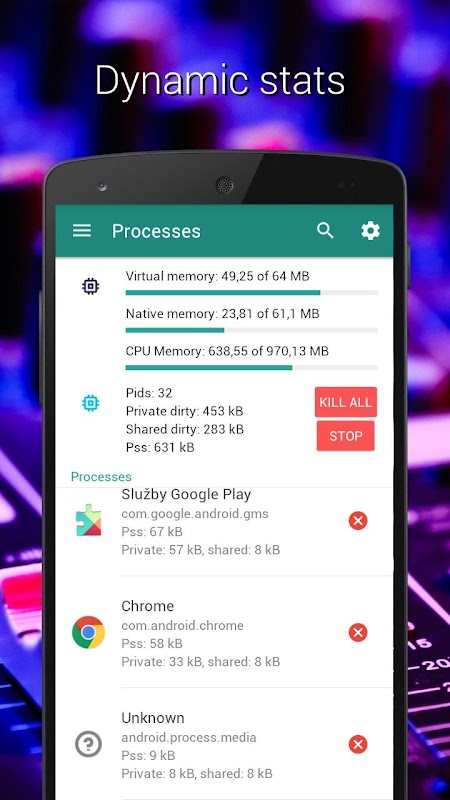 • Memory - gambaran memori, virtual / asli / CPU, PID, PSS, proses