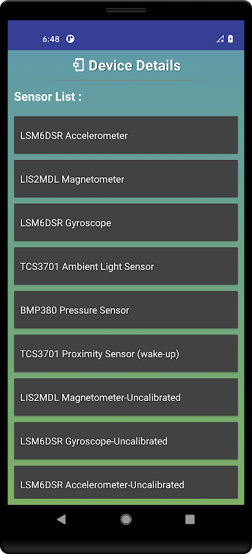 Sensor : Daftar semua Sensor, Nama Sensor, Tipe Int, Vendor, Versi, Resolusi, Daya, Jangkauan maksimum, Pembacaan waktu nyata yang akurat dari sensor