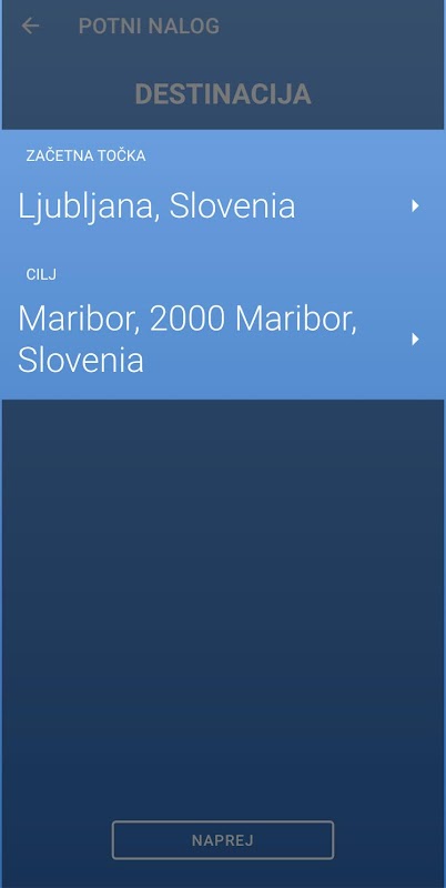 Za izdelavo potnega naloga vam je na voljo vnos vašega voznega parka med katerimi izberete vozilo, nato določite destinacijo. Mobilna aplikacija vam bo ponudila hiter predogled strani in za nadaljevanje enostavno pritisnite gumb ZAČNI. Vsi potni nalogi vam bodo vedno na voljo na preglednem seznamu nalogov.