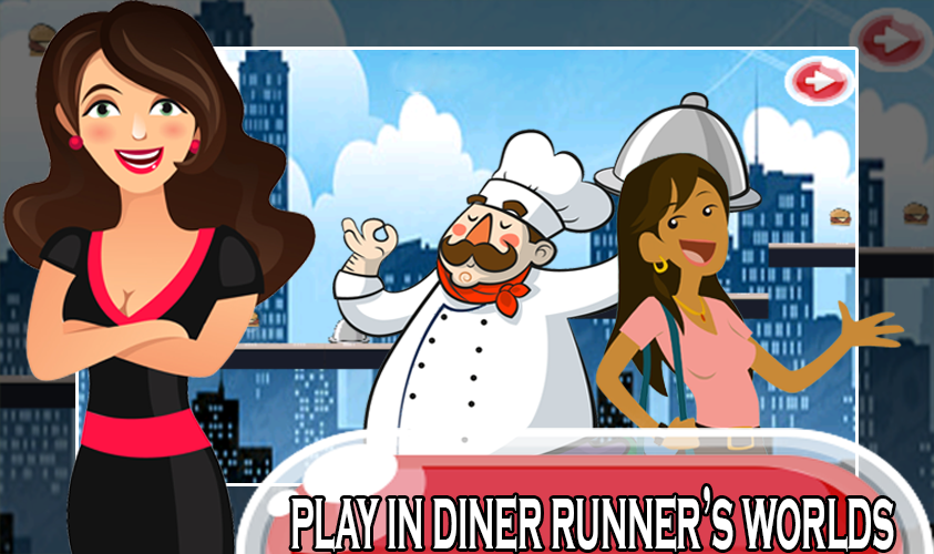 Control your waitress with touching to jump to avoiding obstacles and dangers of different worlds and run to deliver diner , get in the dash.