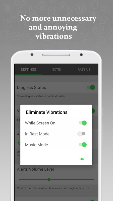 With Dingless there is no need to silence your phone anymore, or totally switch off notification sound in order to avoid annoying alerts coming from your chatting application like Whatsapp, Facebook Messenger or Viber. Be discrete, Go Dingless!