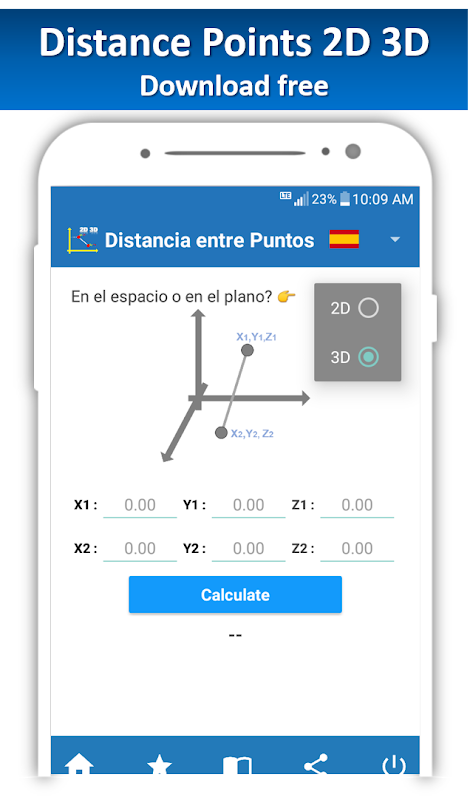 Anda dapat memilih antara 2D atau 3D dan melanjutkan ke penghitungan dari aplikasi kami "Distance Points 2D 3D Calculator"