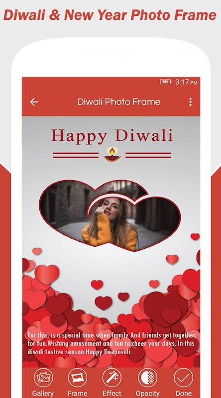 This Diwali Photo Frame is free photo editor for Android is perfect gift for the people you love - you can make the best diwali invitations for the guests and be sure that all of them will come.
