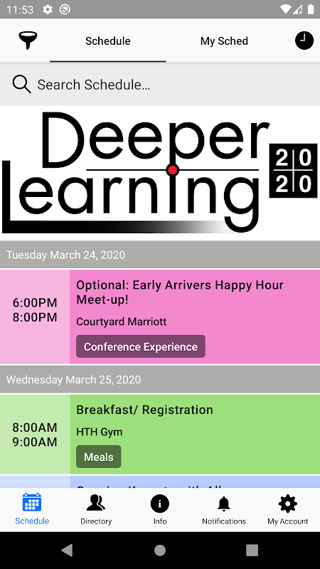 Browse the entire schedule for Deeper Learning 2020. You can filter by color-coded types, venues or search for what you need. Get the full details of every event without having to crack open an event guide.