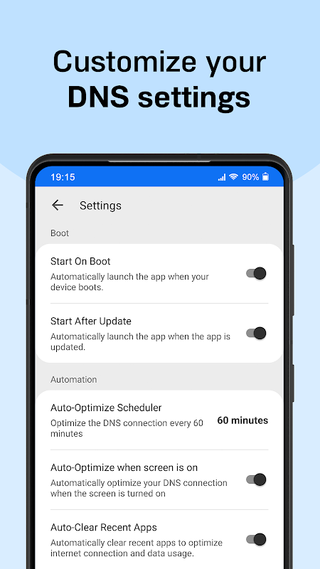 Pengoptimal DNS secara otomatis mendeteksi perubahan jaringan Anda dan terhubung ke server DNS terbaik sesuai dengan koneksi internet Anda. Anda juga dapat menjadwalkan fitur Pengoptimalan Otomatis atau mengoptimalkan secara otomatis setiap kali Anda menghidupkan layar ponsel.