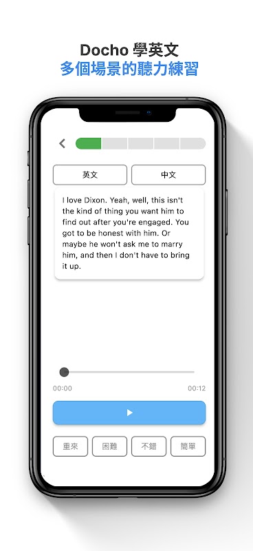 Docho 不斷增加多個場景的聽力練習,每天練習 10 分鐘,英文越聽越清楚