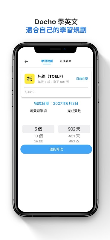 Docho 提供「多益」、「托福」、「全民英檢」、「學測、指考」等多種詞庫,不管是升學考試、出國留學讀書、職場英文檢定,都可以有專門的詞庫進行記憶訓練
