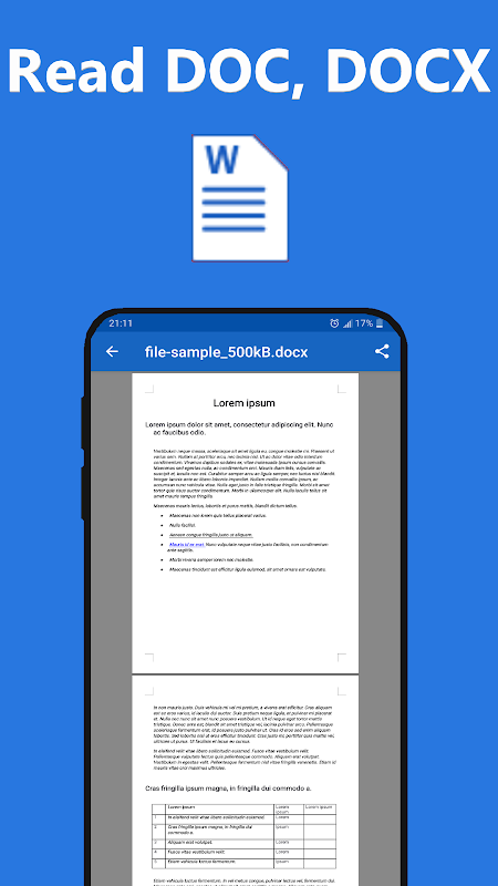 - Secara otomatis mencari dan menampilkan semua file dokumen di telepon Anda.