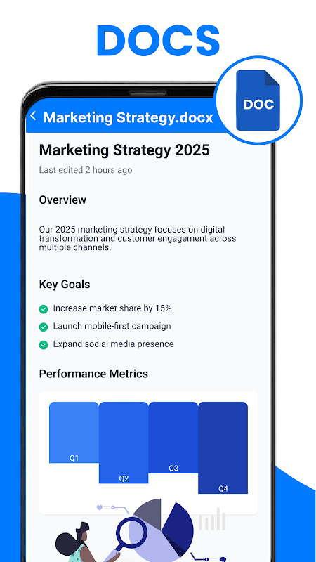 Buka dan modifikasi dokumen Anda dalam hitungan detik menggunakan pembaca dokumen dan pembaca docx pintar kami. Dengan sinkronisasi waktu nyata dan navigasi yang mulus, rasanya seperti memiliki seluruh kantor desktop di dalam saku Anda.