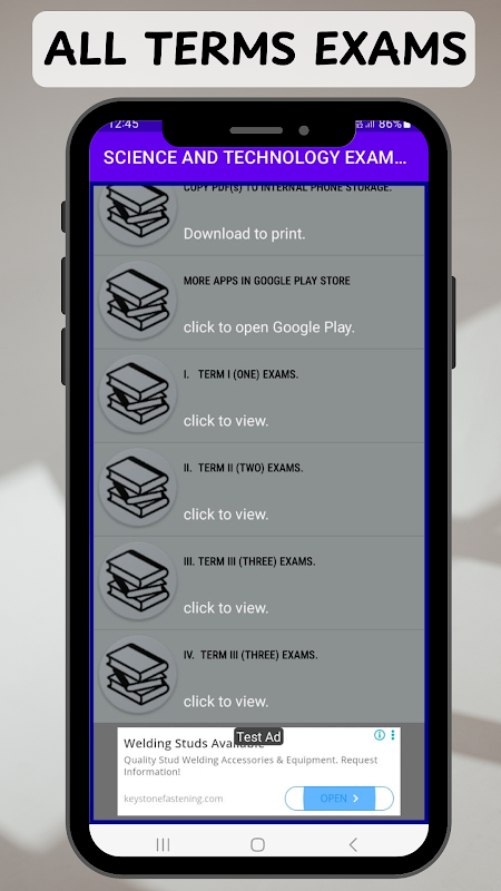 Aplikasi seluler ini berisi Ujian Sains dan Teknologi Kelas 6. Ujian dapat diunduh, diedit, dan dicetak.