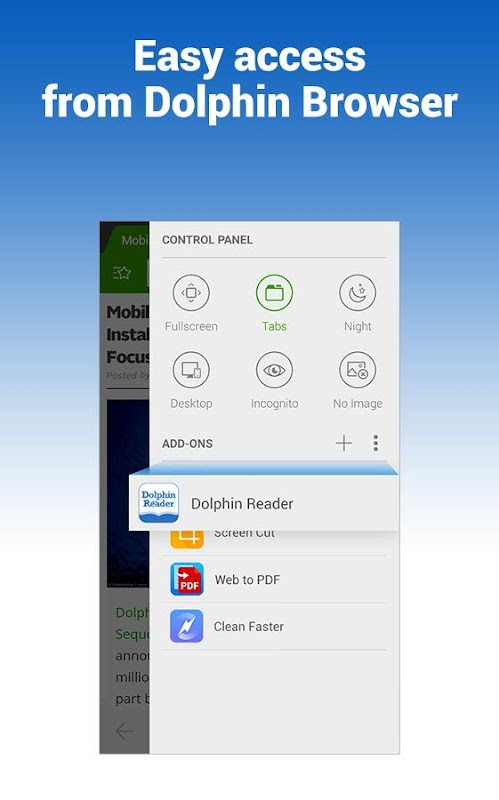 Dolphin Reader is one of the most unique & free apps developed by the Dolphin Browser Team. You can use it like an exclusive Add-on for Dolphin Browser, the best mobile browser with extensive Flash support, Private Mode and the most customizable browsing experience on the market. We have already reached over 150 Million downloads on Android and iOS worldwide and are very happy to receive constructive feedback from you every day. To get more Dolphin Add-ons please visit: http://bit.ly/AndroidAdd-onList