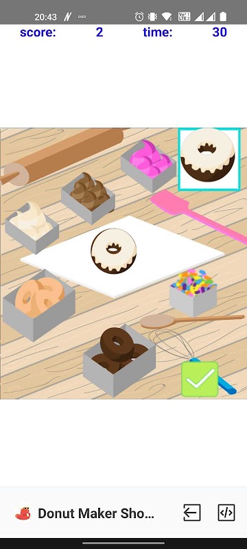 Ini adalah aplikasi pembuat donat. Di sini, tujuannya adalah membuat setidaknya 10 donat dalam 30 detik. Kamu akan mendapatkan 1 poin untuk membuat donat yang benar dan kehilangan 1 poin jika kamu membuat donat yang salah.