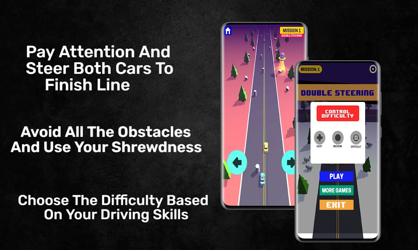 "DOUBLE STEERING" tampaknya keluar dari permainan sederhana, tetapi sebenarnya tidak demikian. Terlalu banyak rintangan. Anda harus tetap fokus dan memperhatikan setiap rintangan, dan jangan lupa Anda mengemudikan dua mobil bukan hanya satu