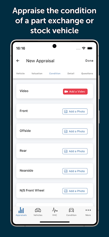 Dengan mudah merekam kondisi pertukaran suku cadang, stok kendaraan, kendaraan untuk pekerjaan servis dan mobil santun dengan gambar dan video. Anda bahkan dapat meminta pelanggan untuk menandatangani Appraisal secara digital di perangkat Anda, menyetujui kondisi yang telah Anda catat.