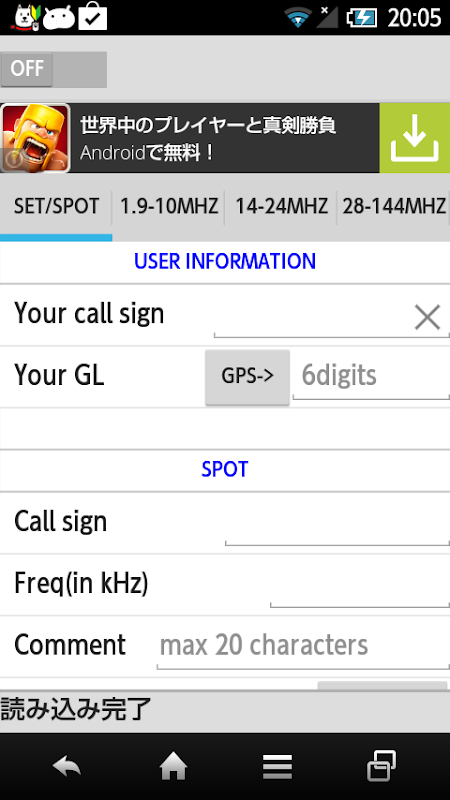 アプリを起動し、SETTING タブで自局のコールサインを入力します。次に、画面丈夫のスイッチをONすることによってDX Cluster サーバーに接続し、スポット情報を受信し始めます。周波数によって3つのタブに分けて表示します。リストビューの表示でJAのコールサインが含まれている場合は日の丸のビットマップで区別できます。各スポット情報の右端のボタンをタップすると、QRZ.COMで該当局の情報を閲覧することができます。