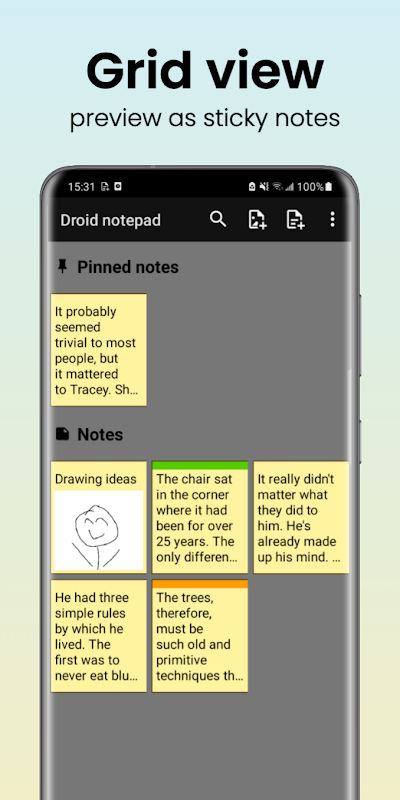 Droid Notepad adalah aplikasi pencatat untuk Android. Ini memungkinkan Anda membuat catatan dengan cepat kapan saja.