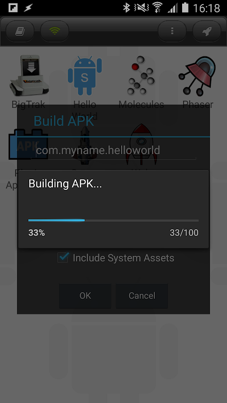 Once the ApkBuilder plugin is installed, you can create APK files by long pressing on your app icon in DroidScript and selecting the 'Build APK' option.