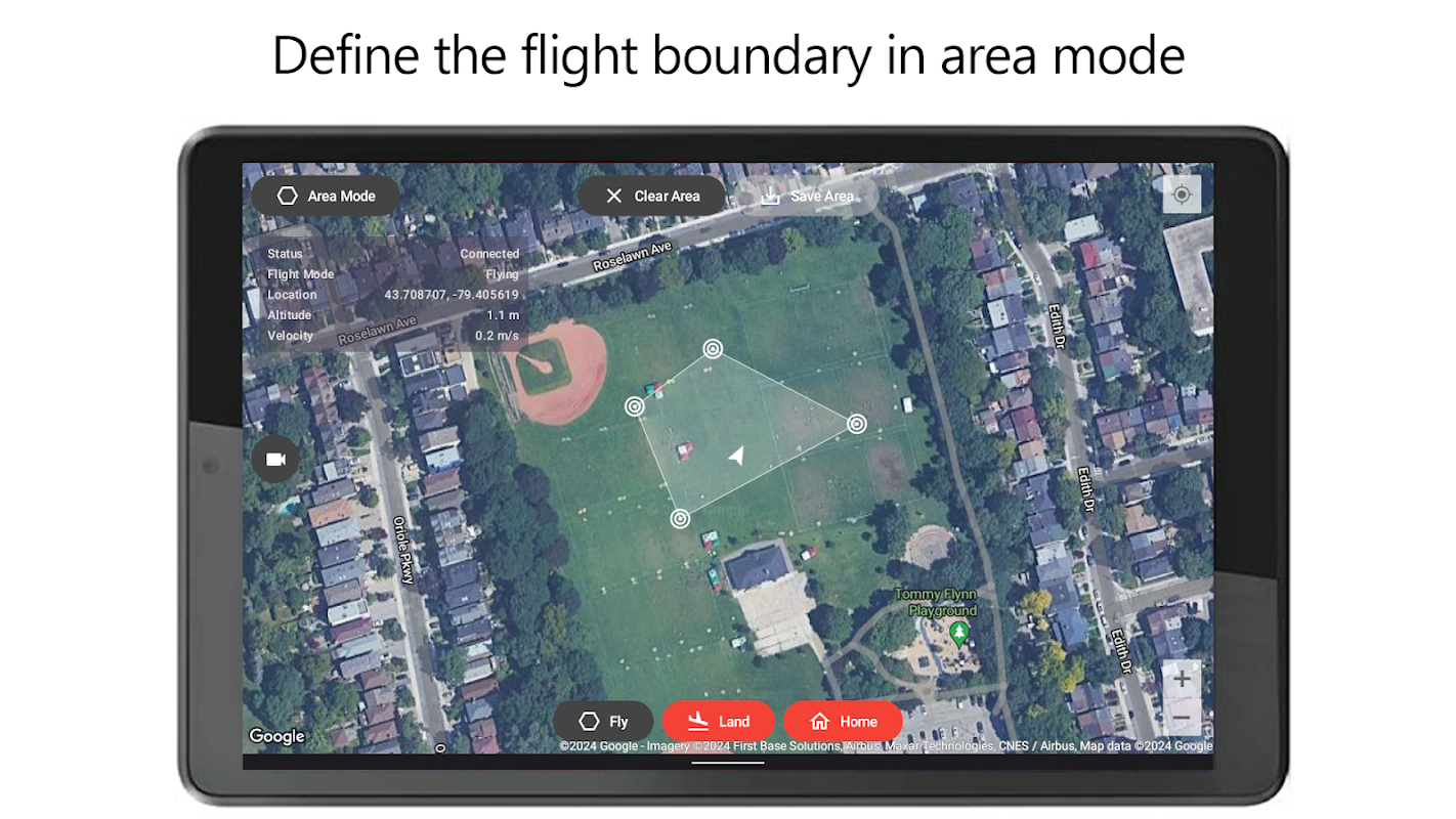 Saat dalam mode Area, mengetuk peta memungkinkan Anda menentukan titik area penerbangan di mana drone akan terbang. Menekan tombol Simpan Area akan menyimpan area penerbangan yang ditentukan dan menampilkannya di peta. Menekan tombol Clear Area akan menghapus area penerbangan yang ditentukan. Anda dapat menentukan area penerbangan dalam bentuk poligonal apa pun.