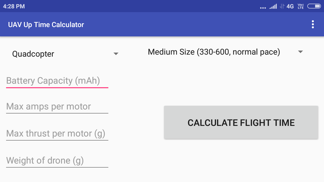 Aplikasi ini membantu (calon) pilot drone mengetahui berapa lama UAV mereka akan mengudara, berdasarkan spesifikasi build mereka. Aplikasi ini ringan, sederhana, dan mudah digunakan.